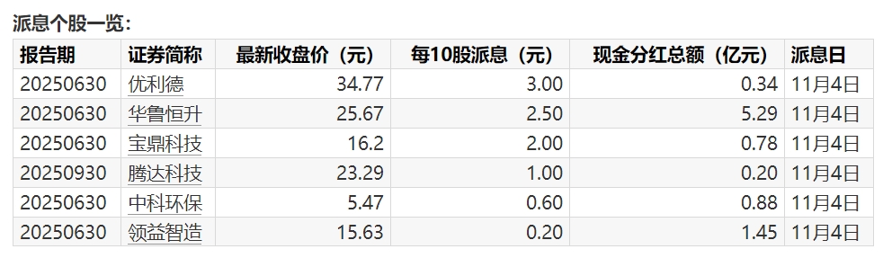 A股分红派息转增一览(11月3日):6股今日股权登记A股分红派息转增一览(11月3日):6股今日股权登记