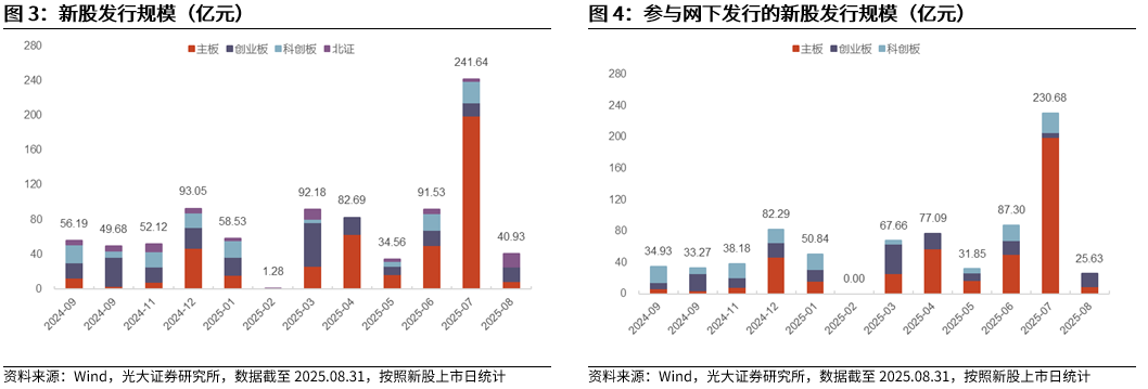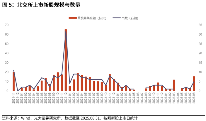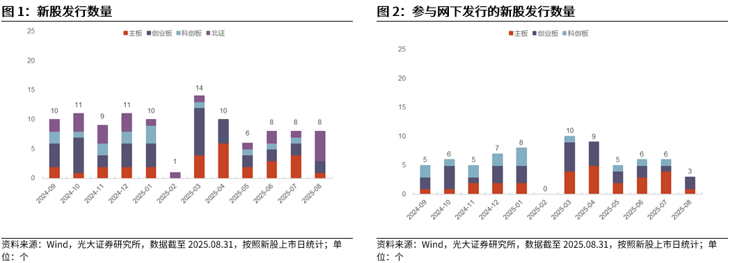8月沪深两市新股发行规模收缩,北交所IPO提速。2025年8月,共8只新股上市,主板1只、创业板2只、北交所5只,募集金额共计40.93亿元,环比-83.06%。