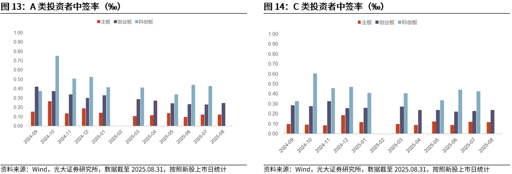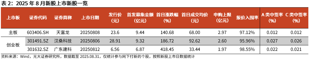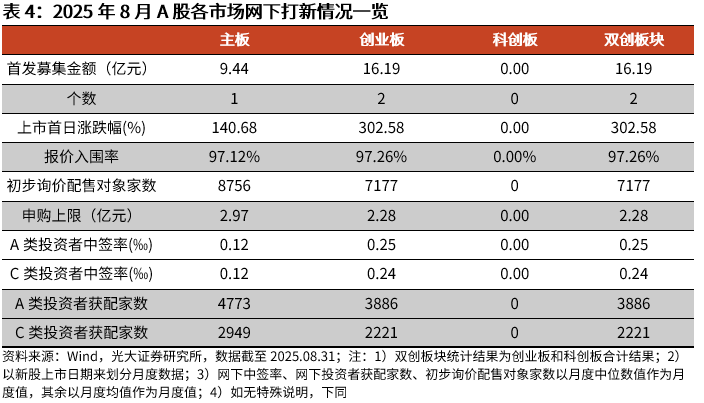 2025年8月,主板采用网下打新的新股1只,上市首日平均涨幅为140.68%,环比-135.61pct,初步询价配售对象为8756家,报价入围率为97.12%,环比+1.45pct;网下中签率分别为A类:0.12‰、C类:0.12‰。