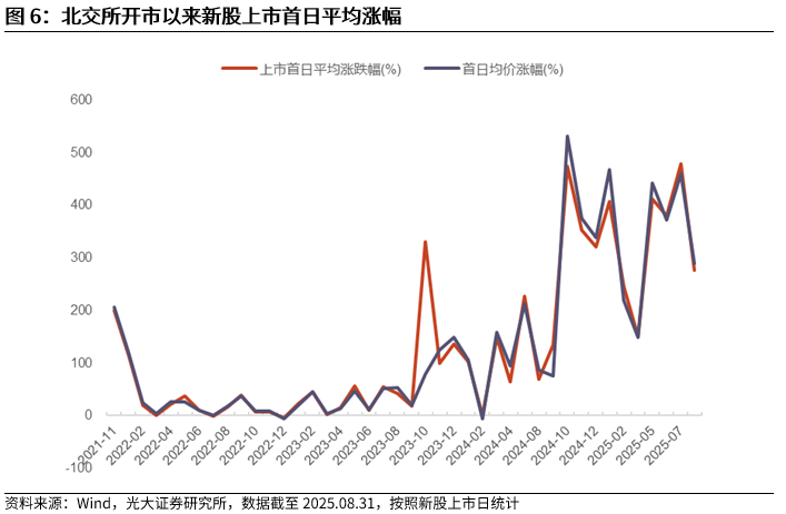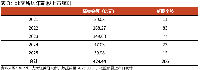 北交所IPO节奏提速,新股上市首日涨幅中枢稳步抬升。截至2025年8月31日,自北交所开市以来,共206只新股在北交所上市,合计募资424.44亿元。