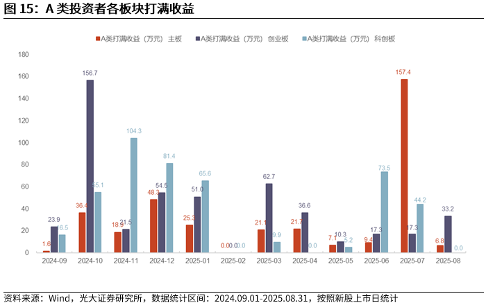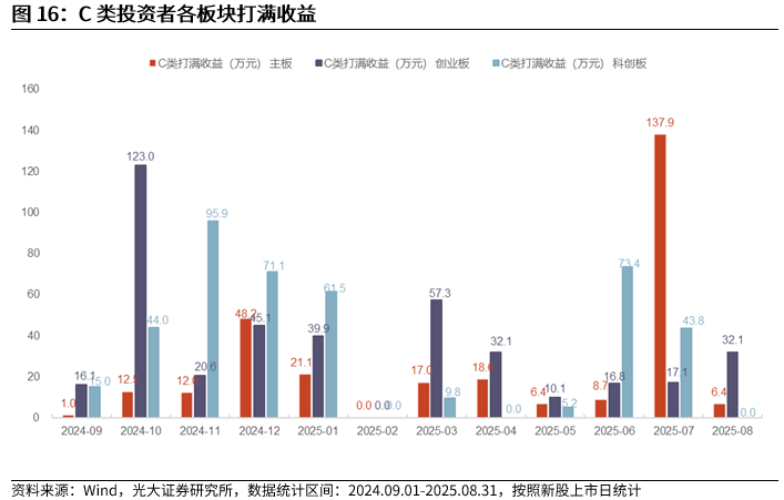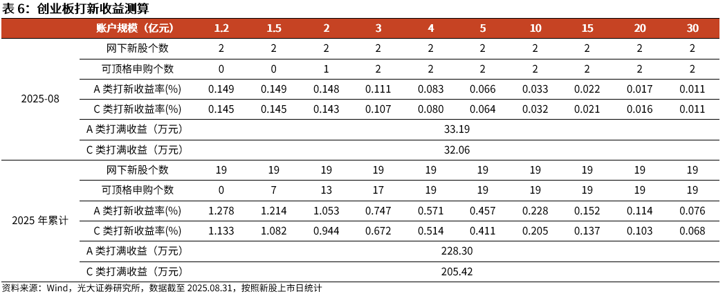 在顶格申购且满中情形下,2025年8月A类账户主板打满收益6.8万元、创业板33.2万元;C类账户主板打满收益6.4万元、创业板32.1万元。