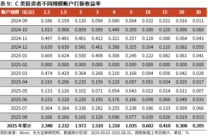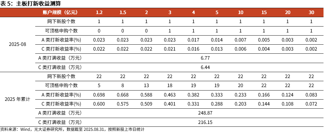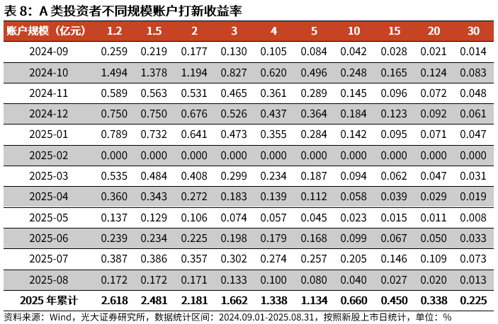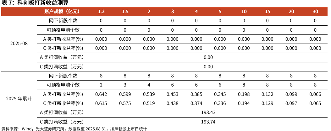 各类账户逐月打新收益测算方面,2025年8月,A类账户5亿规模账户当月打新收益率约为0.080%,2025年累计收益1.134%;C类账户5亿规模账户当月打新收益率约为0.077%,2025年累计收益1.035%。