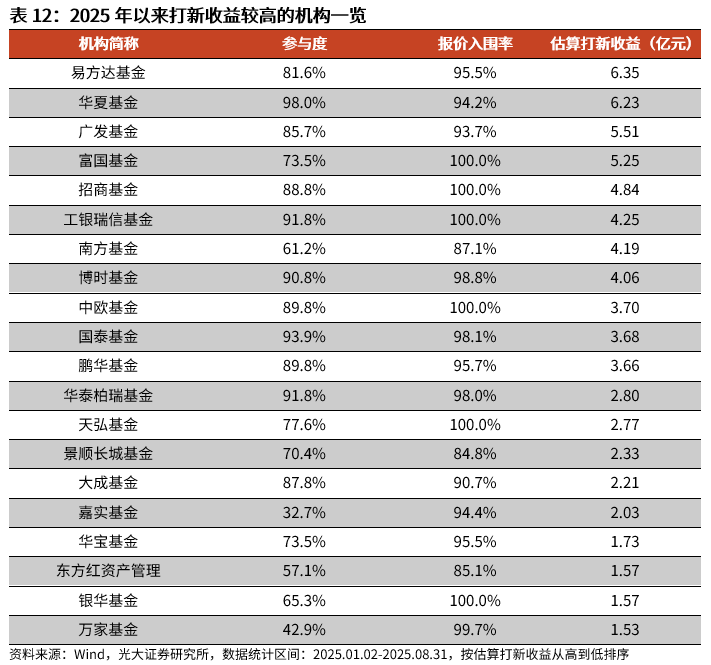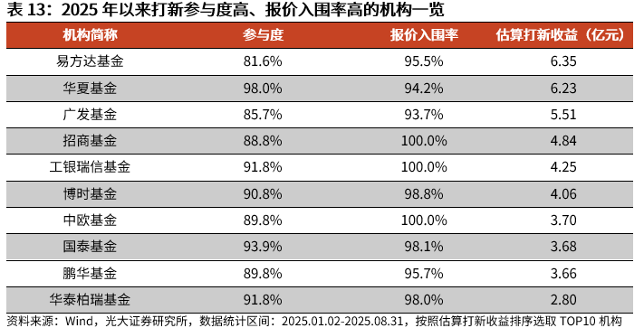 2025年以来打新参与度在80%以上,且报价入围率在90%以上的公募持牌机构共计23家,其中估算打新收益较高的机构如下。