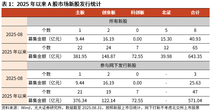2025年8月,共8只新股上市,主板1只、创业板2只、科创板0只、北交所5只,募集金额共计40.93亿元,环比-83.06%。