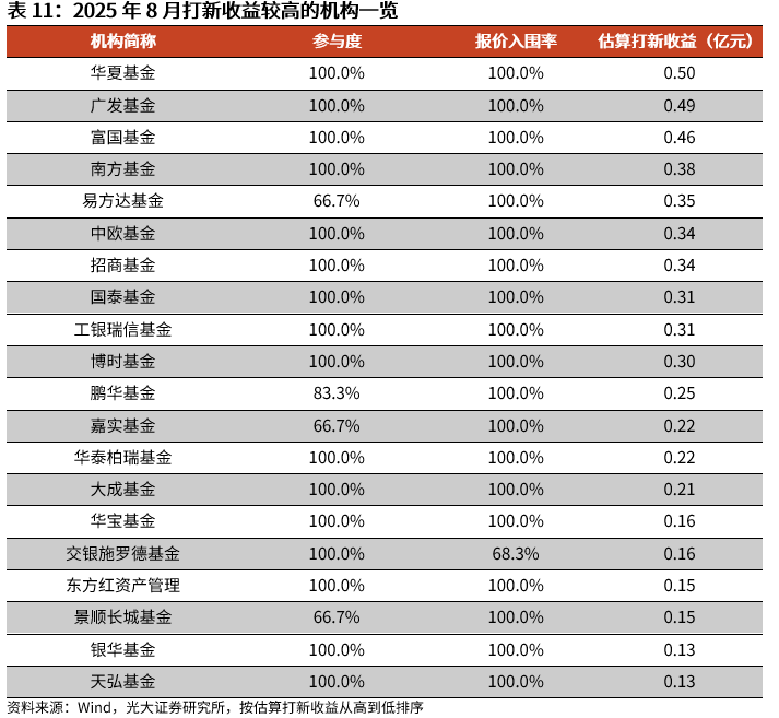 2025年8月,在打新收益较高的20家公募持牌机构中,华夏基金、广发基金、富国基金估算打新收益较高;参与度方面,除易方达基金、鹏华基金、嘉实基金、景顺长城基金外,其余打新收益较高的机构参与所有新股打新;报价入围率方面,除交银施罗德基金外,其余打新收益较高的机构报价入围率为100%。