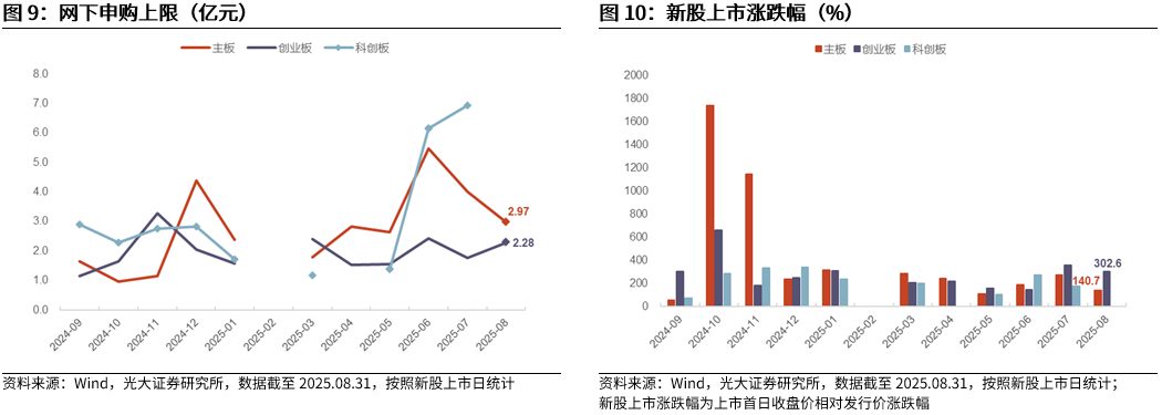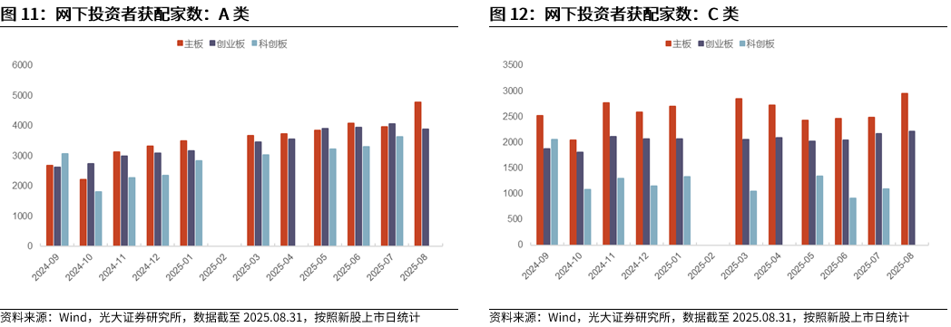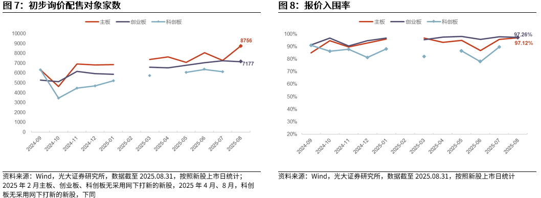 询价账户数量上升。2025年8月,主板采用网下打新的新股1只,上市首日平均涨幅为140.68%,环比-135.61pct,初步询价配售对象为8756家,报价入围率为97.12%,环比+1.45pct;网下中签率分别为A类:0.12‰、C类:0.12‰。
