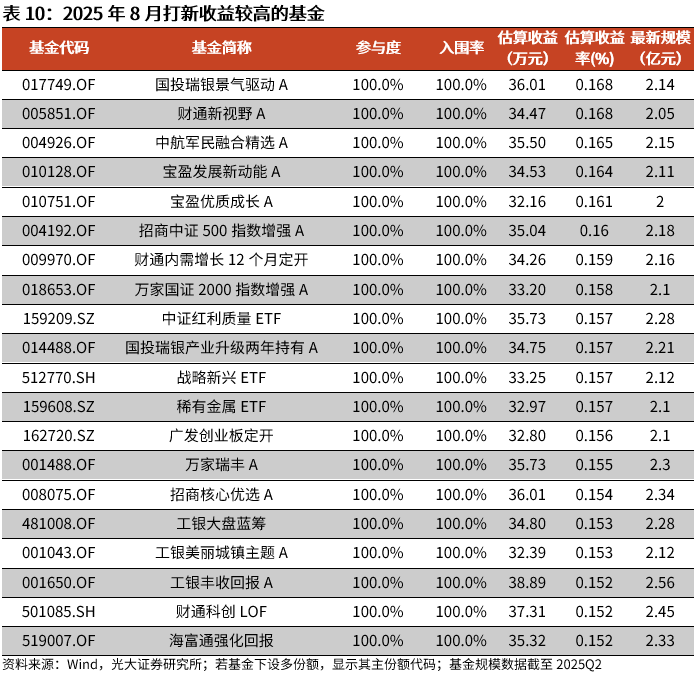 2025年8月,打新参与度>=90%、报价入围率>=85%、且最新基金季报披露规模在2-5亿的基金产品中,估算收益率较高的20只基金如下表所示。